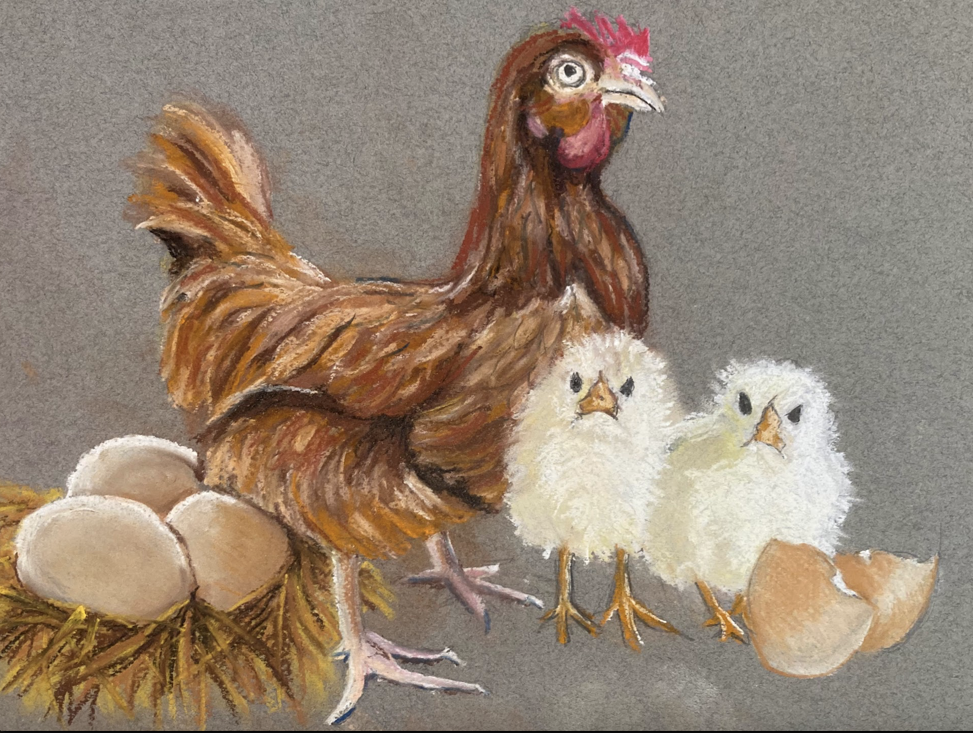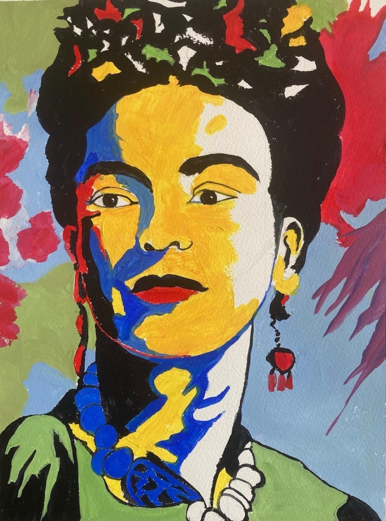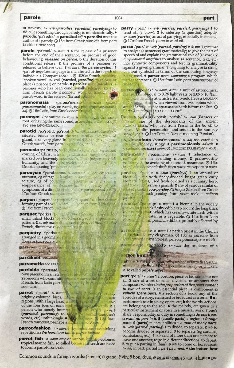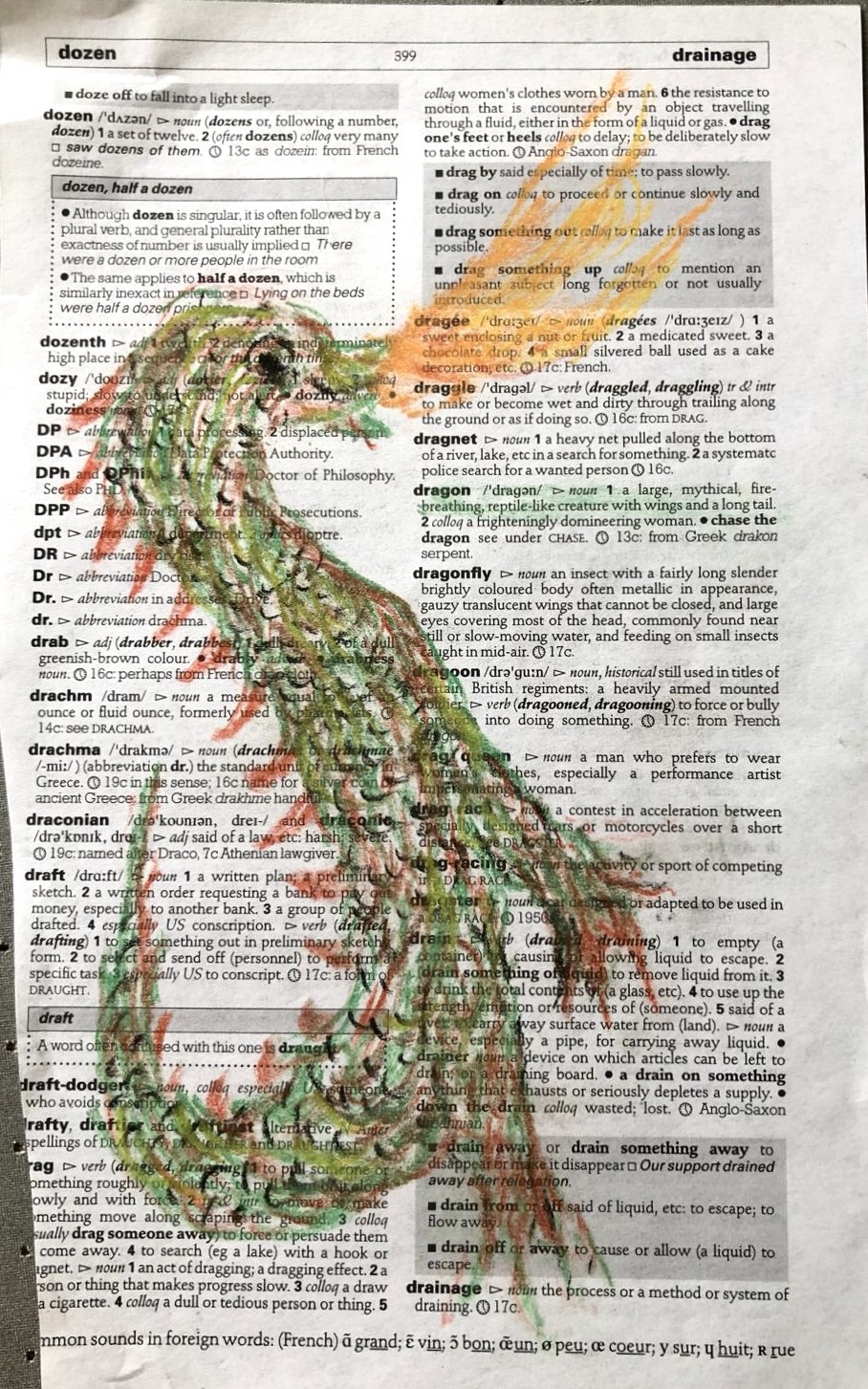 Brenda’s colourful picture of Frida Kahlo is in pastels as are her images of the dragon and the parrot on a dictionary page. The cockerel is painted in watercolours.