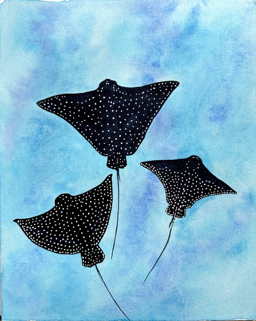 Tracy’s images of Frida Kahlo were painted in watercolours, as were the underwater eagle spotted rays. The cottage garden at Sissinghurst is in coloured pencils, lightly pressed on to the paper so the finished effect is delicate.