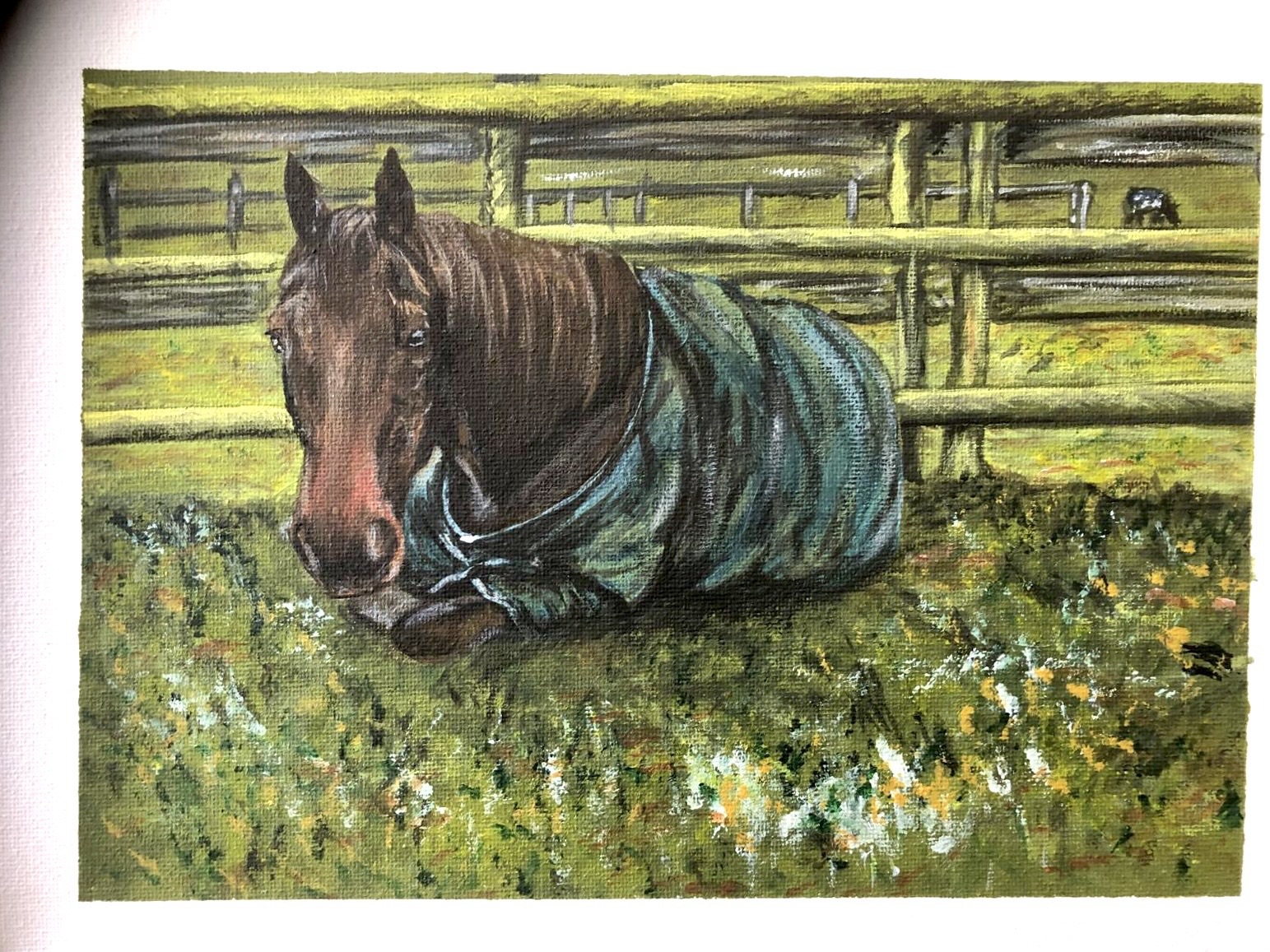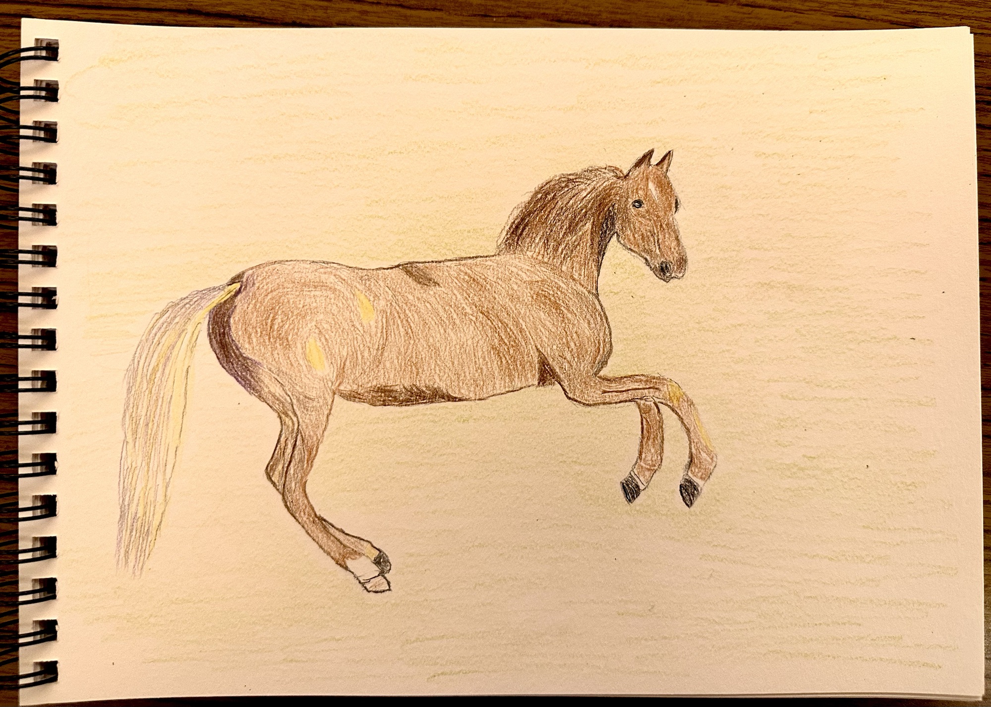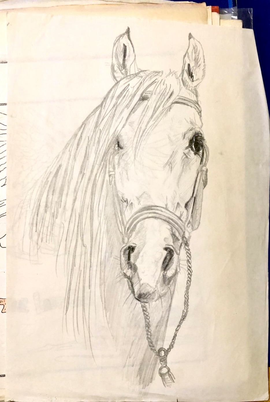 Kay was disappointed not to come to the session as she loves horses. At home she found her sketching book which she had begun at just 5 years old and continued with until her mid teens. The pyrography was done when she was 14 and the last image was painted a couple of years ago as a gift for a friend of her own horse.