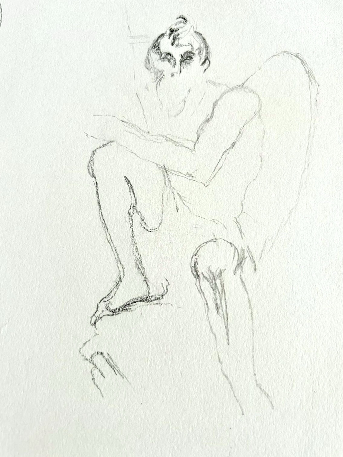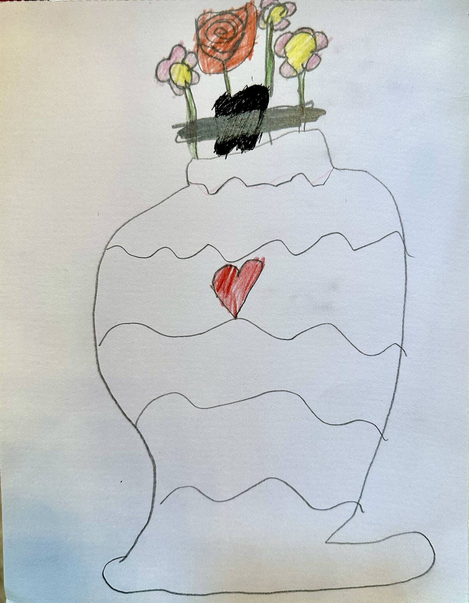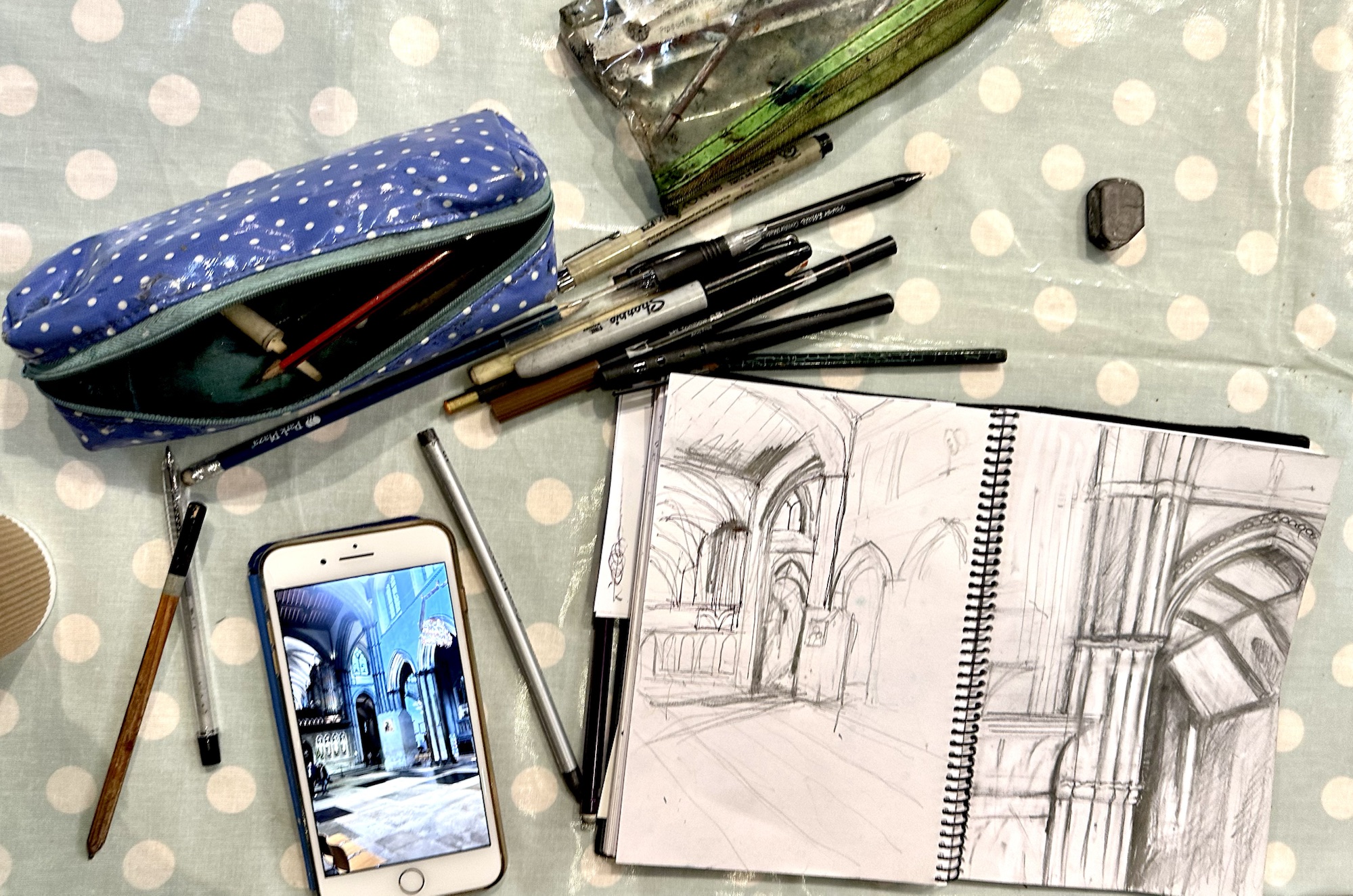 We couldn’t use any paint or water inside the cathedral so everyone sketched using dry mediums of pencils, coloured pencils, charcoal and pens. Most members drew the architecture and views around them but as usual we don’t mind at all if you come along to a session and ‘do your own thing’, so a giraffe and highland cow join the gallery. We start off with the girls’ pictures, including a super picture of Grandad Ron…