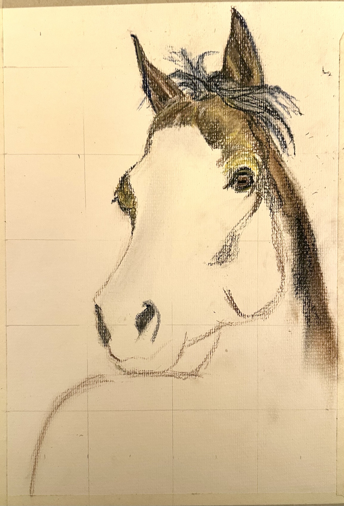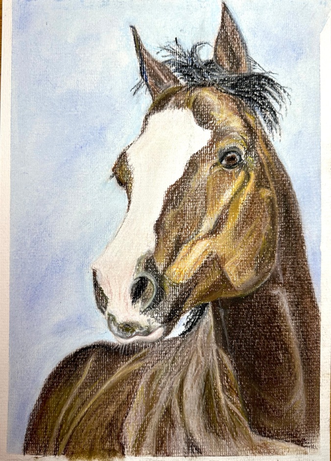 Angela used pastels for her horse picture, using rich browns and tan colours for her bold horse head portrait.
