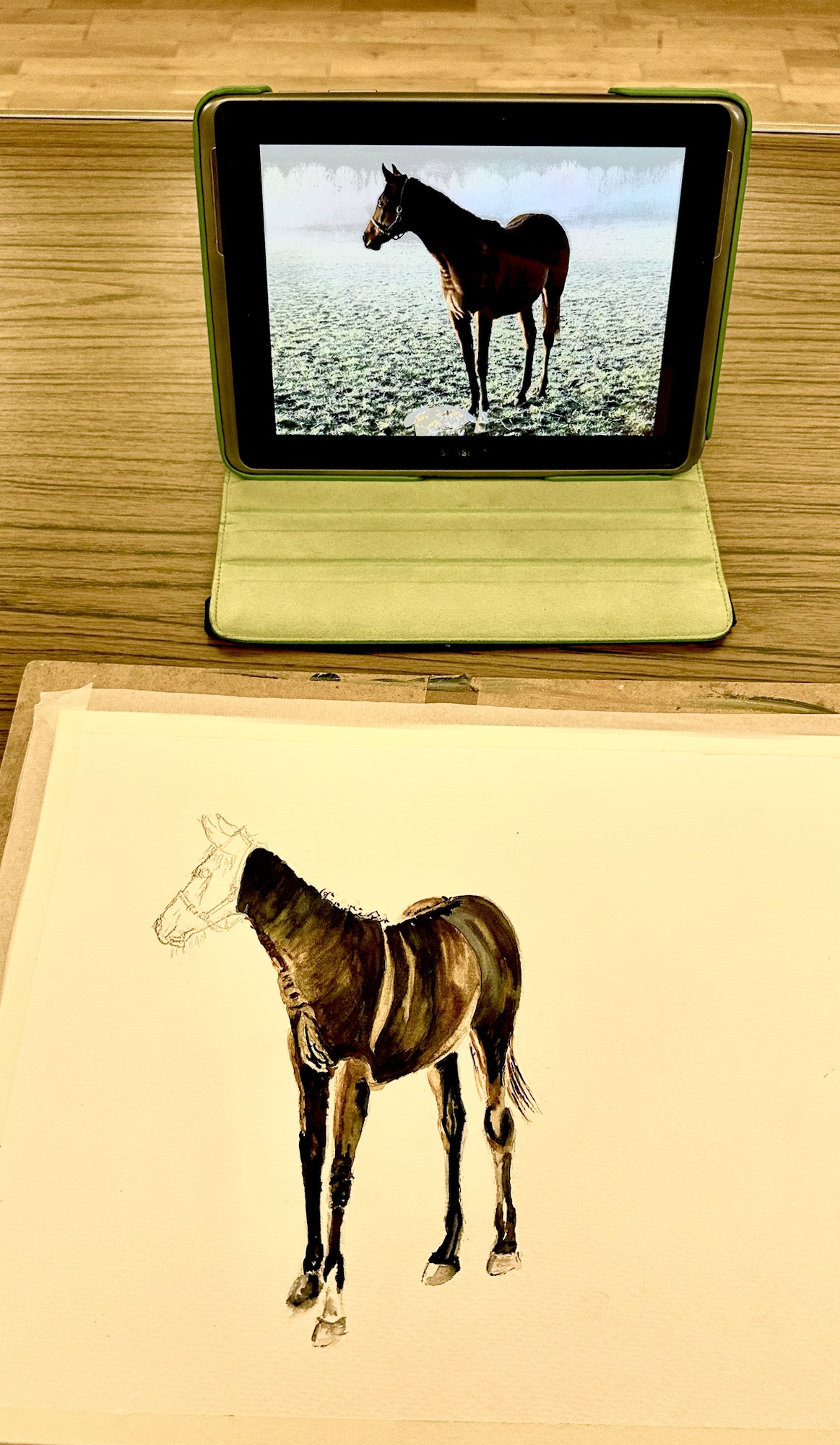 It was lovely to see ten members at the session, all eager to try their hand at drawing and painting horses, which we all thought was quite a challenge. The session was inspired by the birth of George Stubbs 300 years ago this month and his extraordinary paintings of horses in Georgian Britain. His most famous painting is ‘Whistlejacket’ in The National Gallery in London where visitors admire the horse’s perfectly formed body against a plain background so nothing distracts from the horse himself.