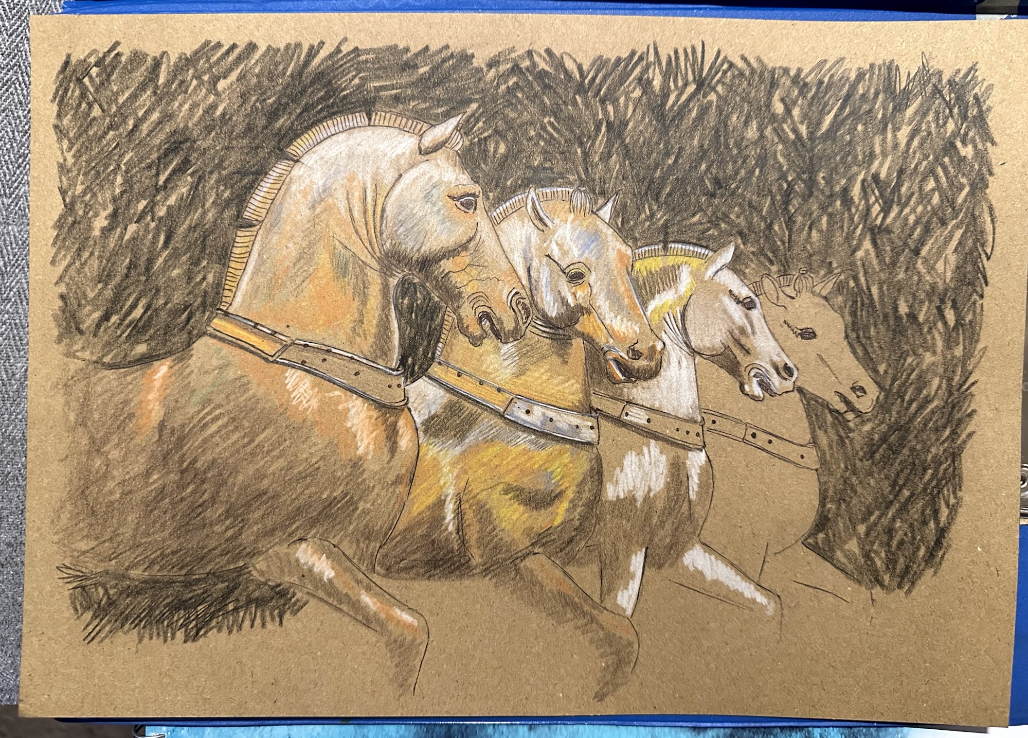 Tracy started with brown paper and used black, white, yellow, orange and brown coloured pencils to create her picture of the horses.